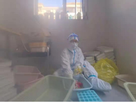 防護服、隔離衣、N95口罩、護目鏡、雙層手套、鞋套......全副武裝后,既不能喝水,也不能上廁所,在實驗室里一待就是七八個小時。在這次檢驗中,李寶華所在的二區(qū)樣品制備間每班四個人,流水線作業(yè),醫(yī)院檢驗科的工作人員負責(zé)將標(biāo)本加入到提取試劑孔中,李寶華負責(zé)將樣本放在核酸提取儀里提取,然后將提取好的核酸交給下一位工作人員加入到八連排試管架中,然后四個人輪換的把八連管的蓋扣緊。在這個特別費手指頭的環(huán)節(jié),每個人都要連扣幾板,按著按著手指痛的就按不動了??此坪唵蔚墓ぷ?,卻要求全神貫注,一絲不茍,認真的拆分、上架,同時要做好個人手衛(wèi)生,無數(shù)次重復(fù)的實驗,需要嚴謹細心的態(tài)度,確保實驗結(jié)果準(zhǔn)確無誤。一天工作下來,滿身是汗,耳朵也被口罩壓出紅印子,面部也有深深的壓痕。雖然核酸檢測工作很艱辛,李寶華卻無悔加入到這支平凡而不普通的隊伍。防疫戰(zhàn)線上,無論是下沉小區(qū)值守的“守衛(wèi)者”,還是核酸檢測的“掃雷員”,都都抗議路上逆行孤勇者,他們用點點微光,匯聚起戰(zhàn)勝疫情的強大力量。我們向他(她)們致敬,感謝他們的每一份付出。